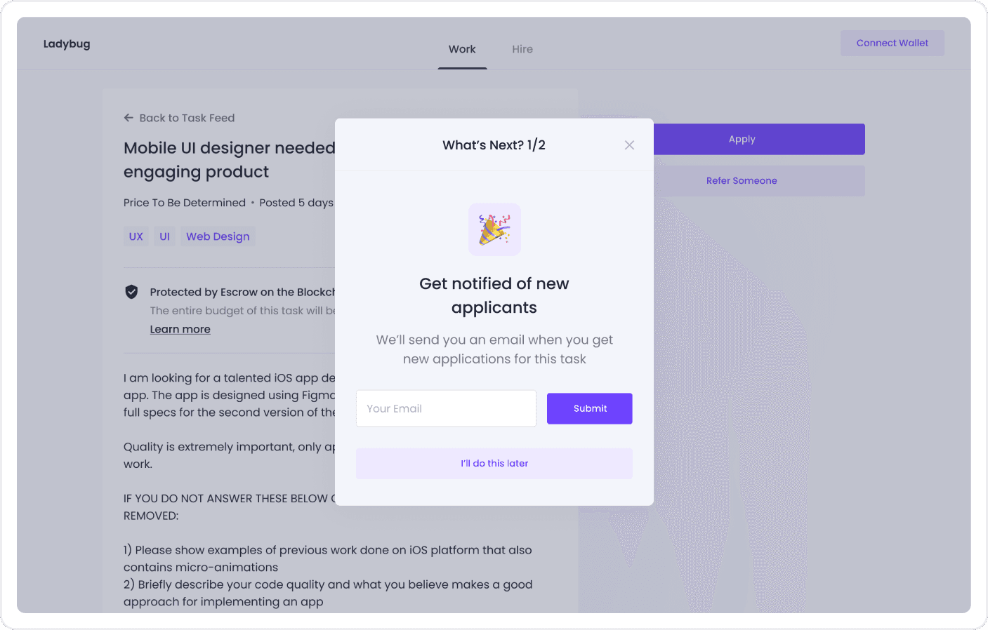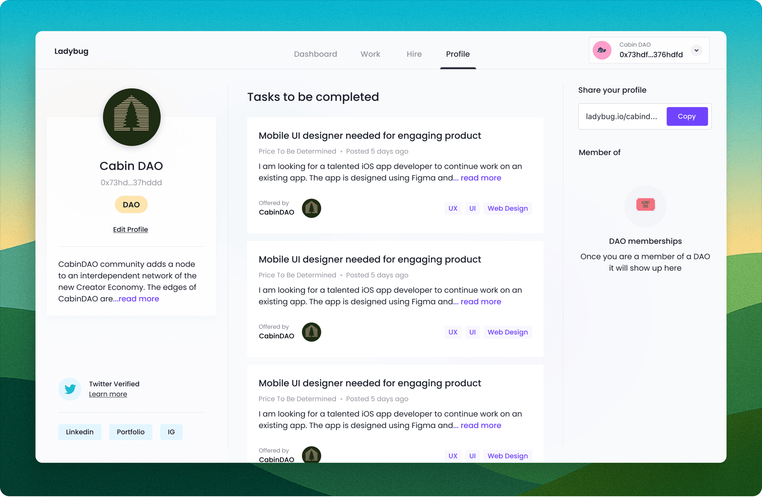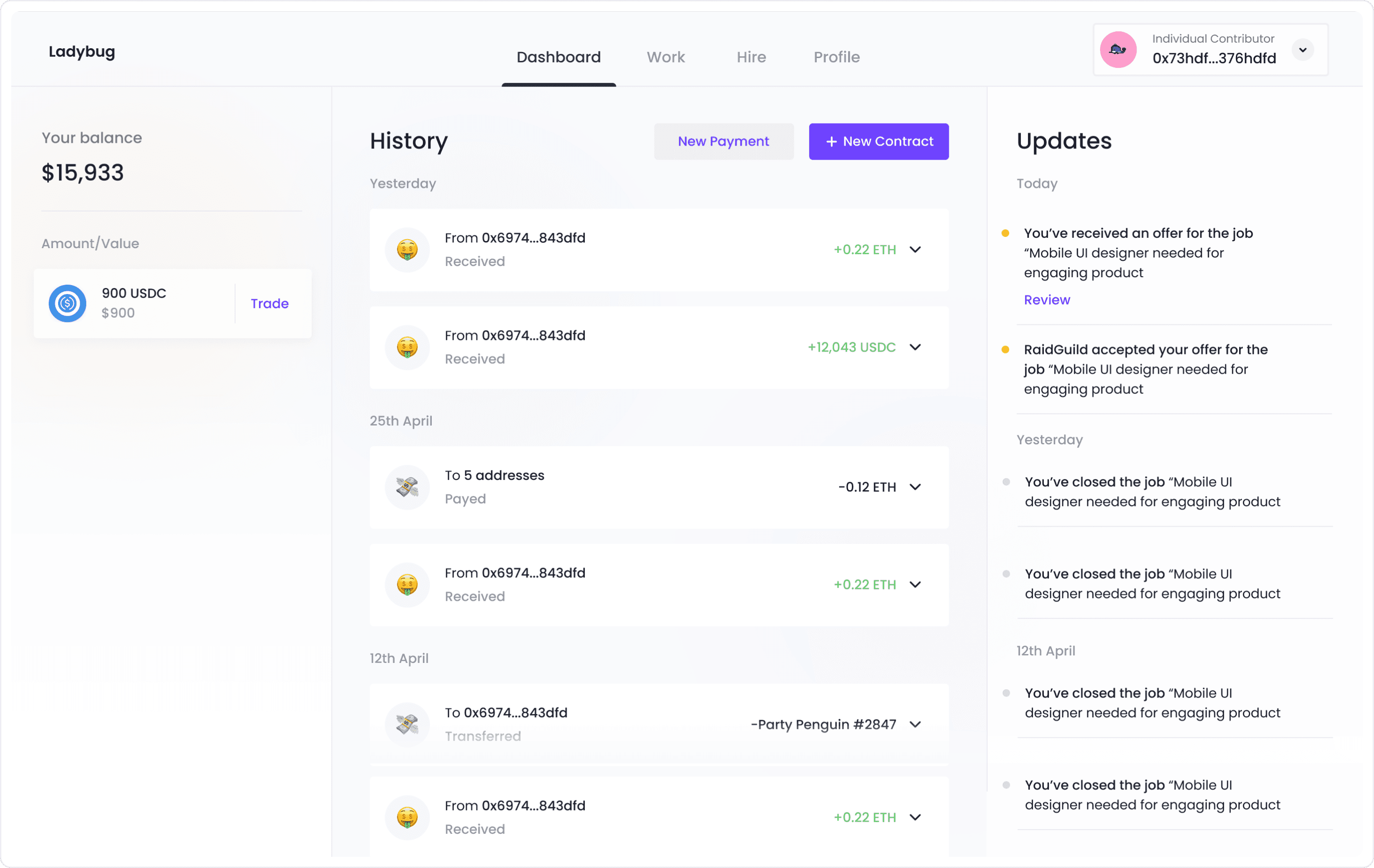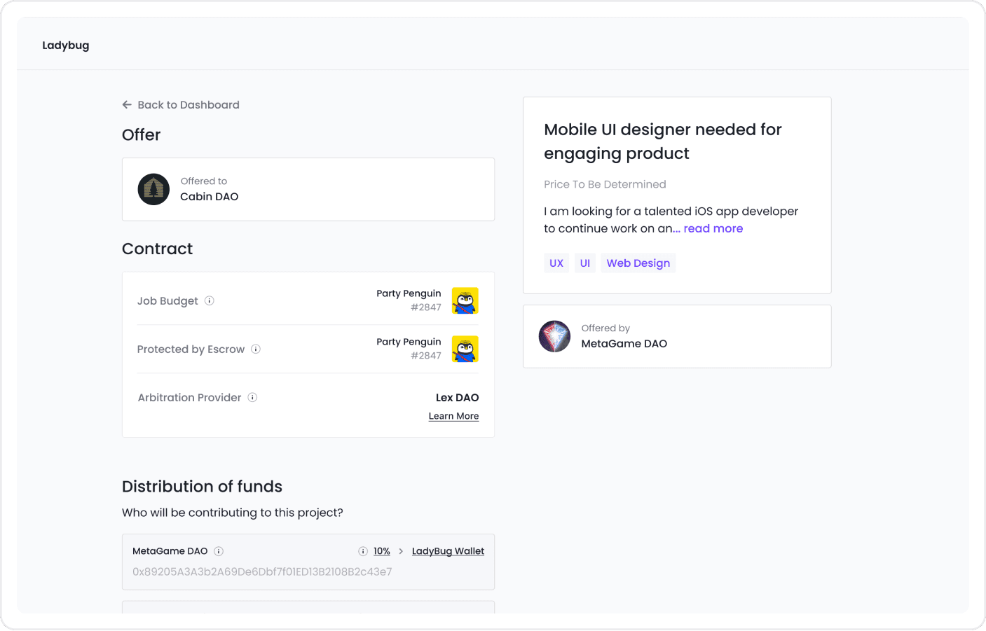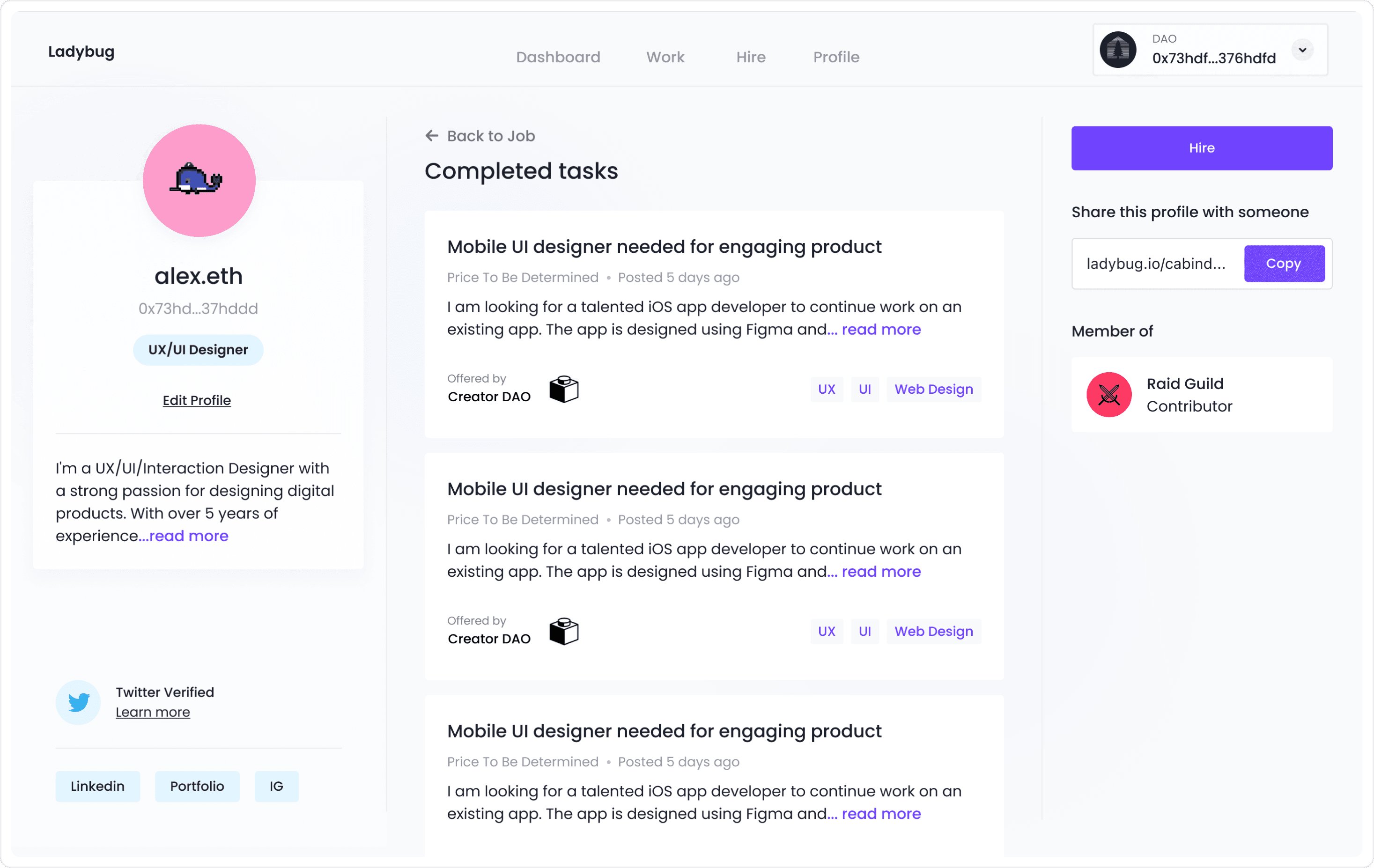 Ladybug is an online marketplace where anyone can find and hire freelance talent. The team needed us to come up with a design that would allow contractors to post jobs and hire freelancers based on their onchain work history.