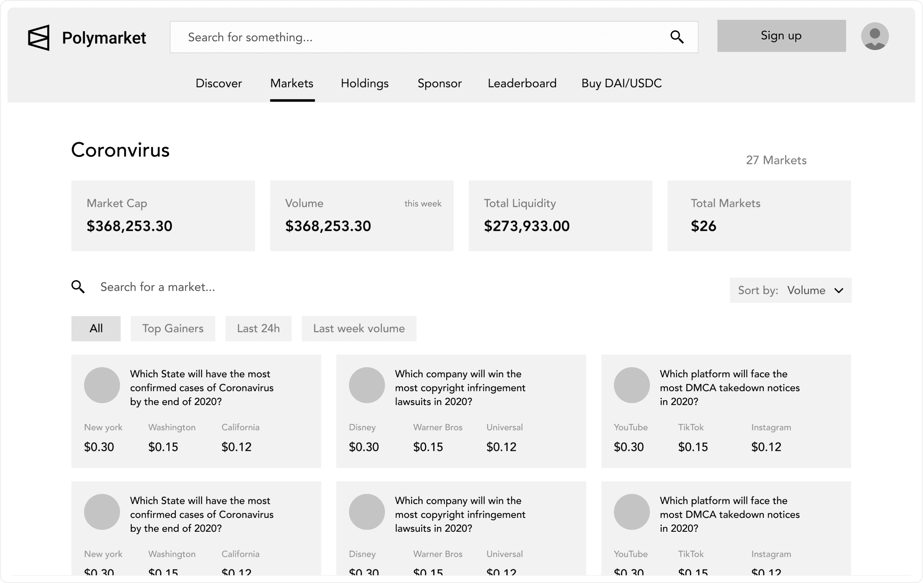 After a couple of calls with Shayne, we started researching current solutions, trying to understand the needs and potential features that would position ourselves differently than the competition. The output of the sprint was a simple UX design flow showcasing some of the most important parts of Polymarket.