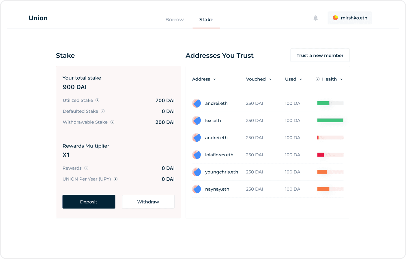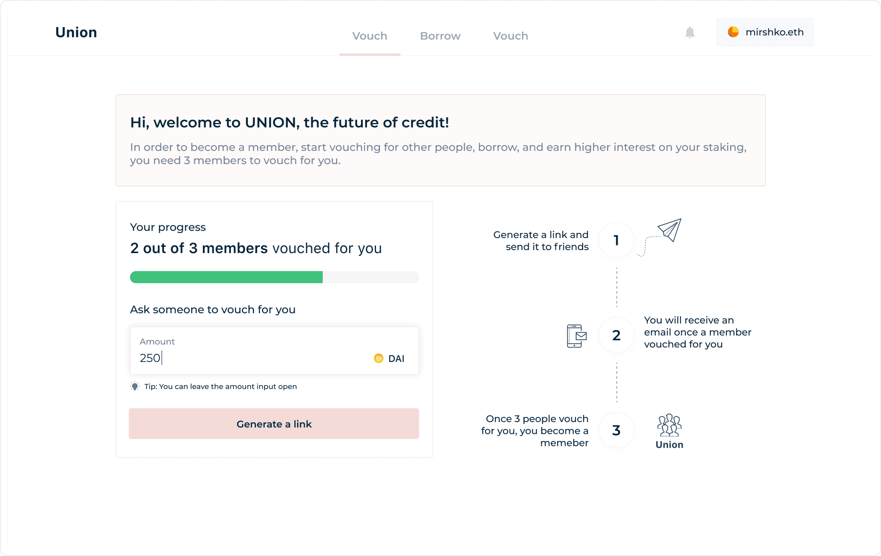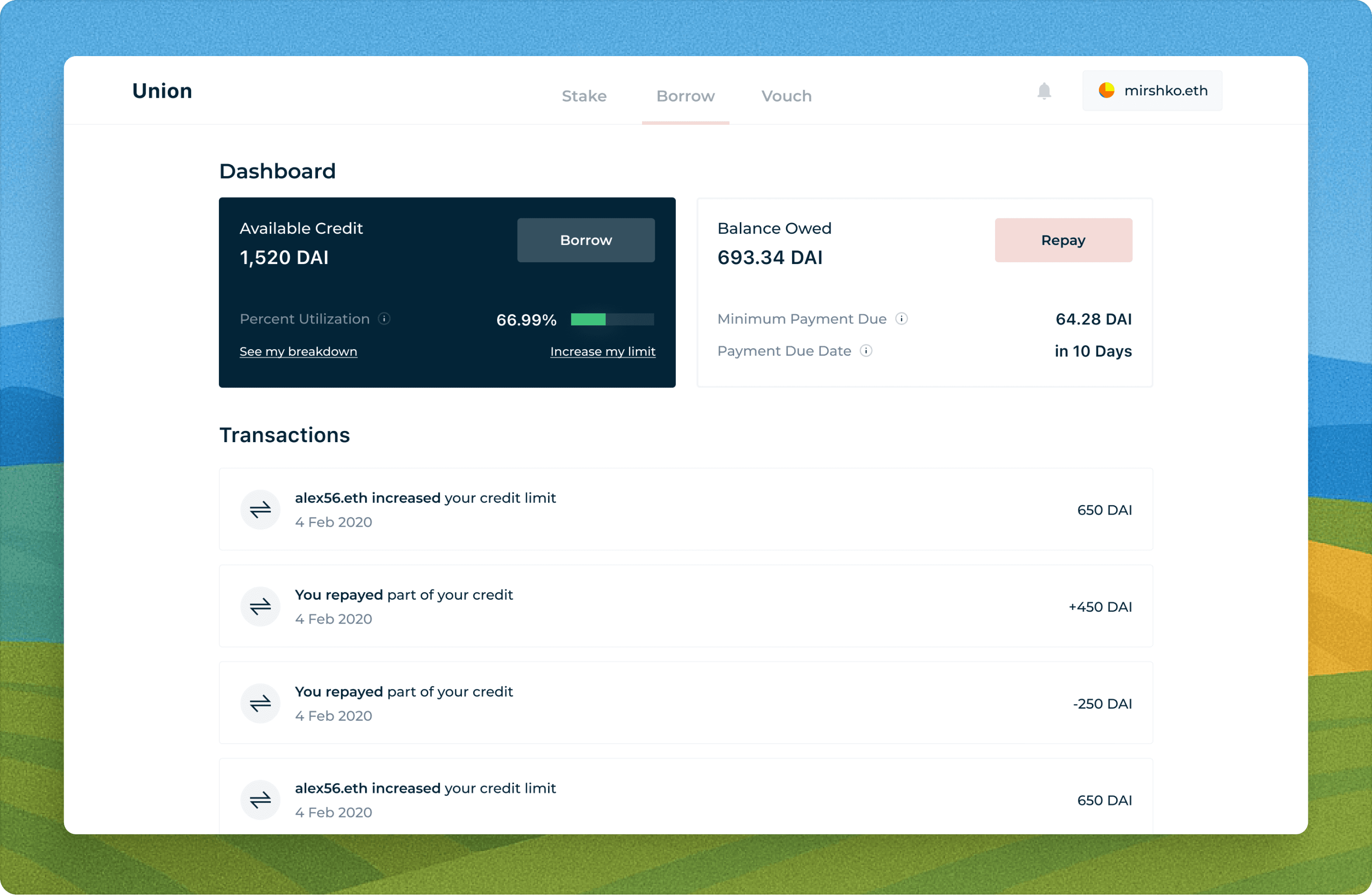 Union Finance is transforming what it means to borrow and lend on the blockchain by introducing the element of trust. Our mission was to reimagine how peer-to-peer lending and borrowing would look like in an interface, while crafting a flow that is easy to understand.