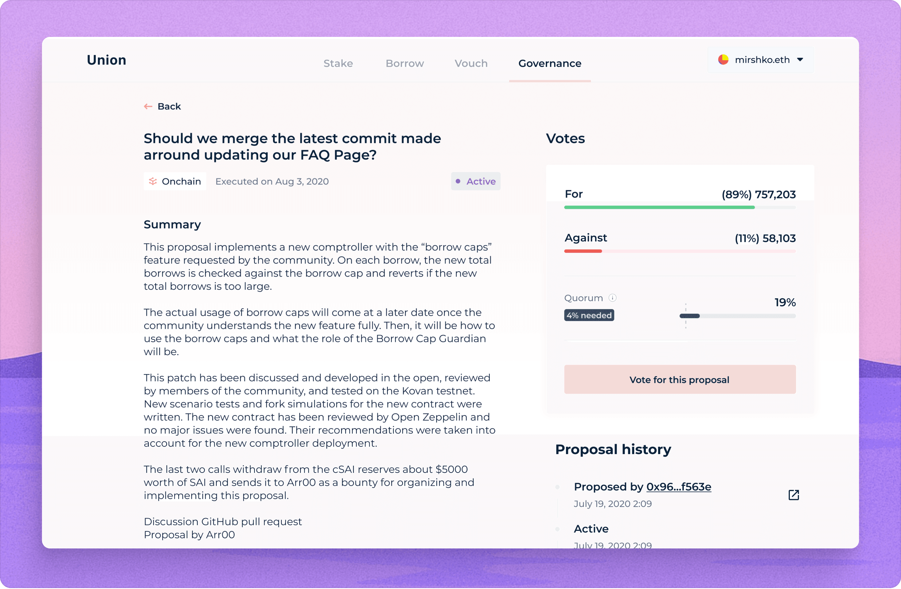 Union Finance aimed to enhance community involvement by creating a new governance platform. Our mission was to help Union enable their peer-to-peer lending participants to vote on proposals, ensuring transparency and trust within their ecosystem.
